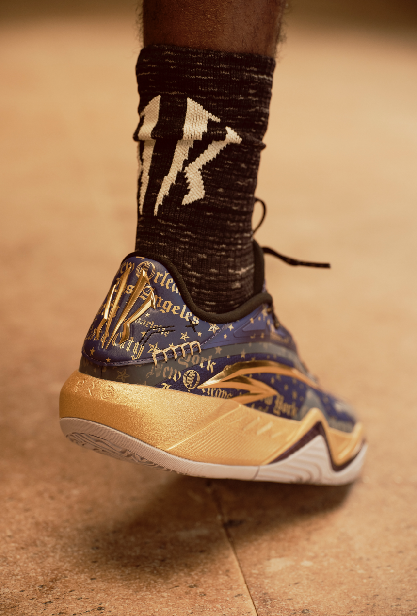 The shoe is covered in purple & gold. Honoring the game, KAl's mentor, and the city draped in purple & gold.